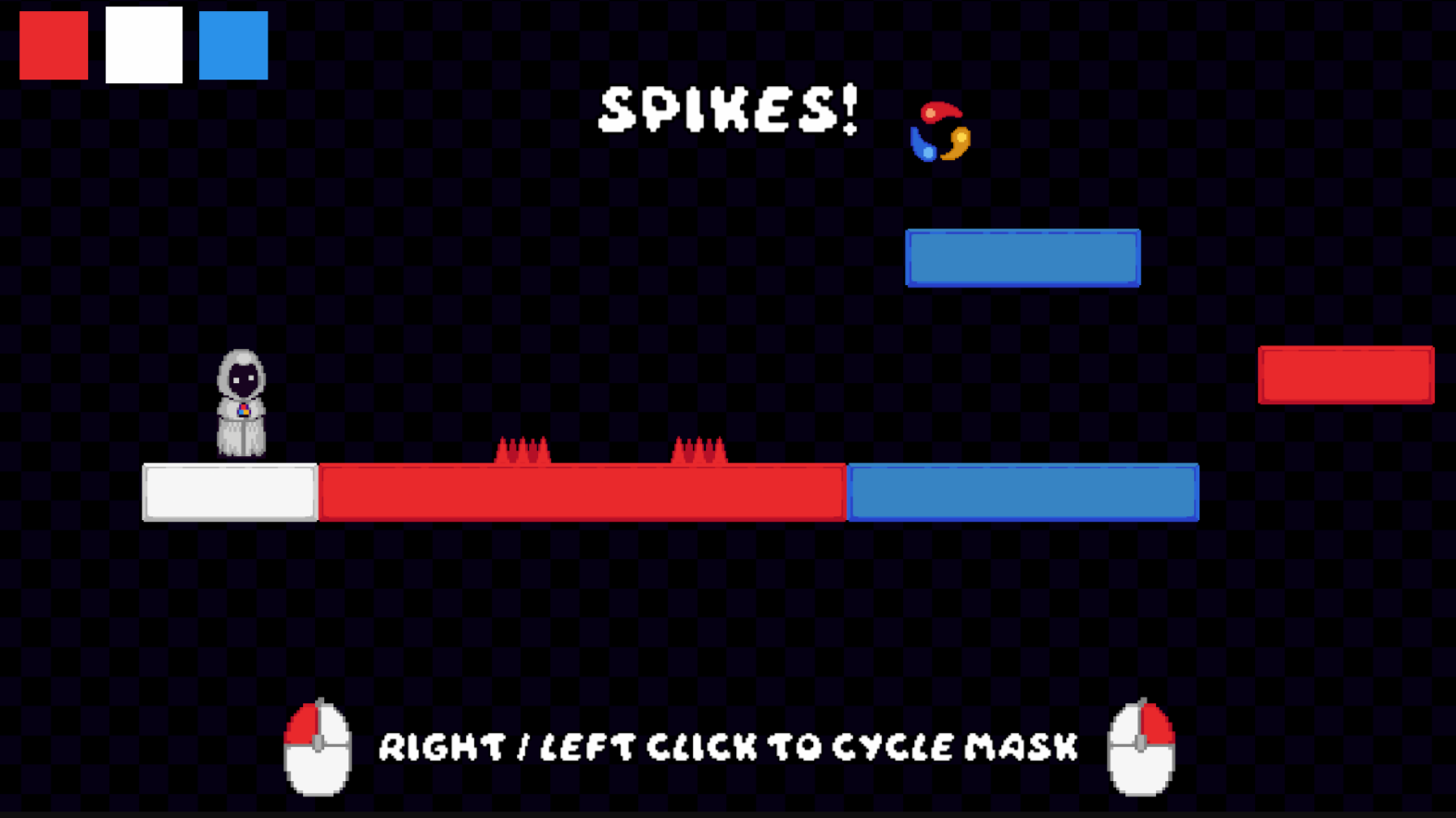 You always have one mask equipped. Every mask resembles a color state, and only objects with that color appear. Platforms can appear beneath your feet. Spikes can vanish midjump. Switch at the wrong moment, and you die...